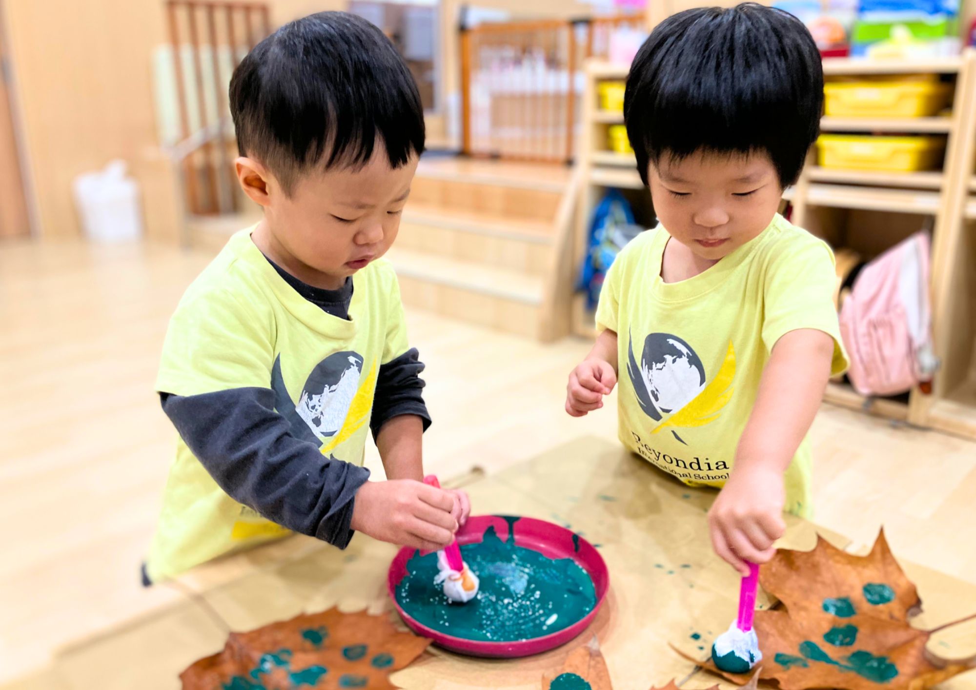 子どもたちはお気に入りの色を使って葉っぱにペイントやスタンプをし、色を混ぜて新しい色を作る姿も見られました。