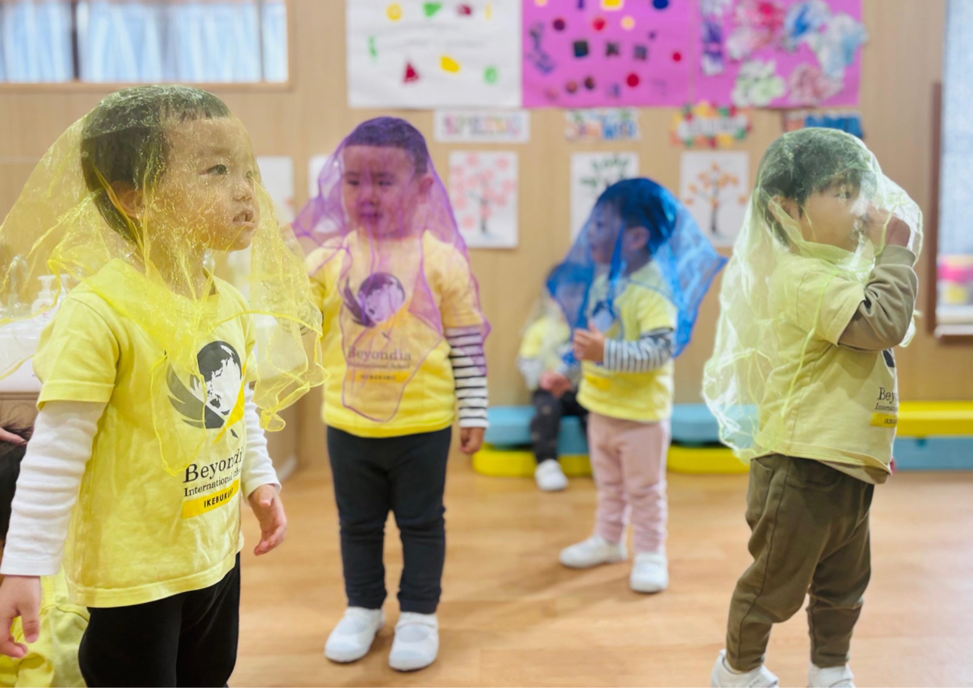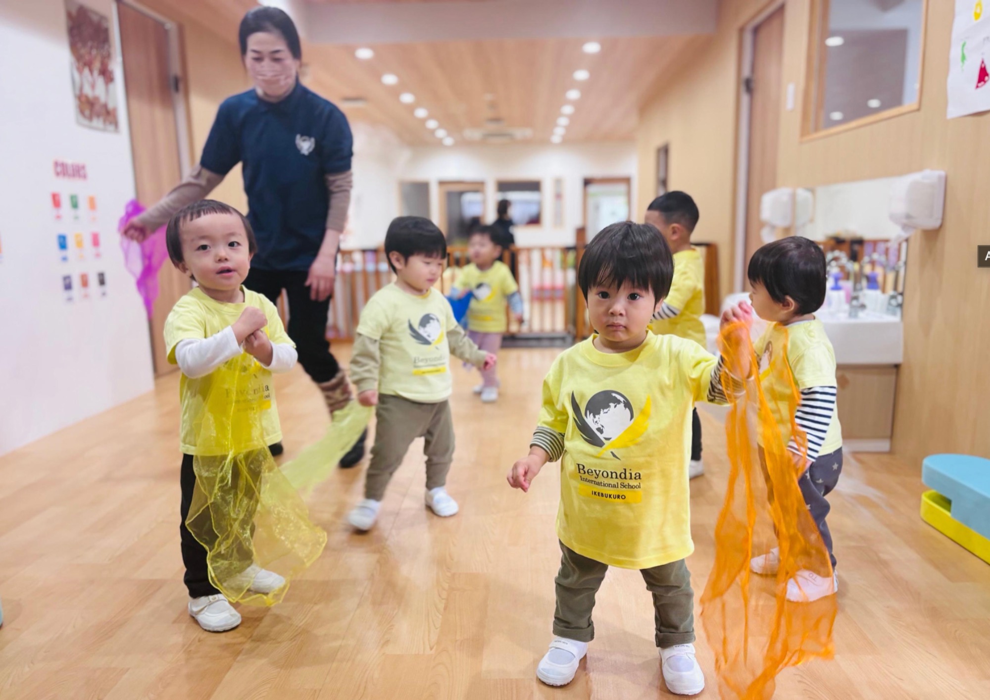 パンプキン・ピーナッツクラスでは、毎週リトミックのレッスンを楽しんでいます。レッスンは名前呼び、歩いて止まる、リズムを聴く、スカーフ遊び、最後の落ち着きの時間、といった基本の流れに沿って行われ、季節のゲームやお話など、新しい要素も取り入れています。最近では、ベビー&ママプログラムのお友だちと保護者も参加しており、親子での音楽や運動体験を通して、社会性や表現力を育む貴重な機会となっています。